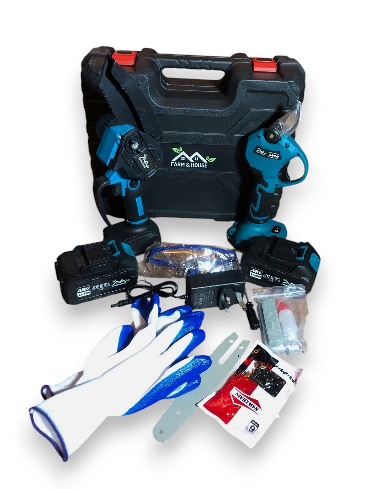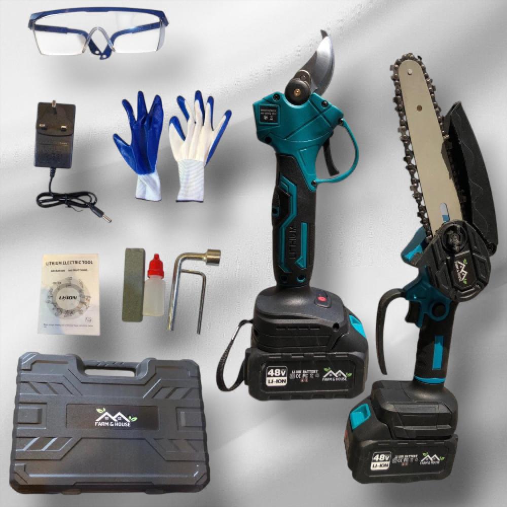 - المجموعة تحتوي على مقص تقليم كهربائي 40 ملم ومنشار كهربائي لاسلكي 6 انش وبطاريتين ليثيوم 48 فولت مزدوجة الخلايا وشاحن ونظارة وقفازات وجنزير وادوات صيانة مع منشور ارشادي وشنطة.